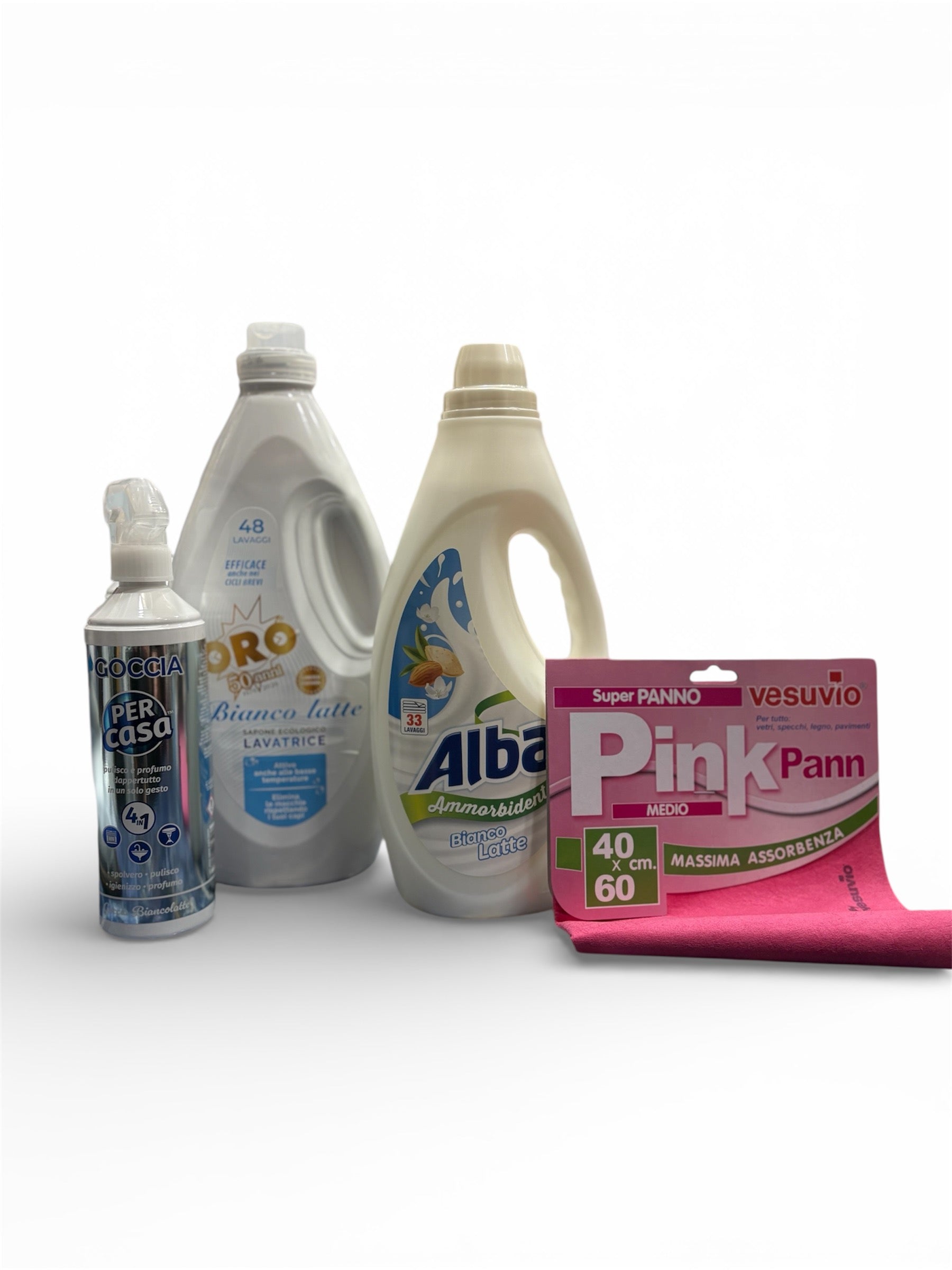 Spray goccia bianco latte pulisco profumo spolvero e igienizzo, ammorbidente Alba bianco latte,oro detersivo bianco latte e il magico panno pink con massima assorbenza